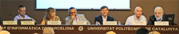 La composición de la mesa del acto inaugural de la conferencia reflejaba fielmente el apoyo institucional, que queremos agradecer desde estas líneas. Presidida por el Rector de la UPC, el matemático Enric Fossas, le acompañaban la decana de la Facultad de Informática, Núria Castell; el presidente de la RSME, Antonio Campillo; el Presidente de la SCM, Xavier Jarque; el director del CRM, Joaquim Bruna; el Decano la la Facultad de Matemáticas y Estadística de la UPC (Jaume Franch, quien no pudo estar presente físicamente por una dificultad circunstancial de aquella mañana); y, como presidente del Comité Organizador, quien suscribe estas líneas.