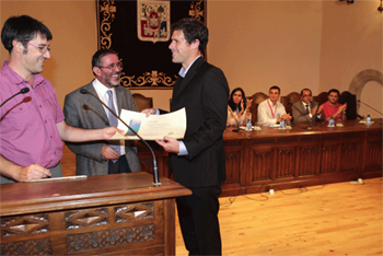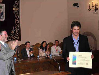 Carlos Beltrán recibiendo el Premio de Julio Bernúes y Adolfo Quirós. En la mesa, Isabel Benjumea, Edgar Martínez, Luis Rey y Javier Parcet