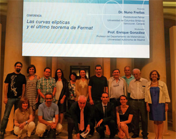El pasado día 29 de Junio tuvo lugar en el palacio del Marqués de Salamanca de Madrid, sede de la Fundación BBVA, la conferencia “Las curvas elípticas y el último teorema de Fermat”, de Nuno Freitas, ganador del premio José Luis Rubio de Francia 2014 de la RSME.Ante un auditorio repleto, el profesor Enrique González Jiménez, de la UAM, presentó al conferenciante, detallando sus muchos logros profesionales. El presentador destacó el hecho de que la Teoría de Números haya tenido una gran repercusión este año, con el premio Rubio de Francia a N. Freitas y el premio Abel de Andrew Wiles, justamente por la demostración del teorema del que trató la conferencia.
