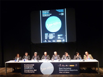 La ceremonia inaugural estuvo dividida en tres partes. La primera correspondió a la conferencia inaugural que corrió a cargo de Cédric Villani (Medalla Fields 2010) con el título “Interacting particle systems and Landau damping”. A continuación se dio paso a un turno de intervenciones de la mesa presidencial formada por Consuelo Martínez (Presidenta del Comité Científico del Congreso), María Jesús Carro Rosell (Presidenta del Comité C3 del Centenario), Antonio Campillo (Presidente de la RSME), Daniel Hernández (Rector de la Universidad de Salamanca), José Mª Muñoz Porras (Presidente del Comité Organizador del Congreso), Miguel Ángel García Nieto (Alcalde de Ávila), Juan José Mateos (Consejero de Educación de la Junta de Castilla y León) y Felipe Pétriz (Secretario de Estado de Investigación) y se procedió a la entrega de los premios José Luis Rubio de Francia correspondientes a las ediciones de 2008 y 2009 a Francisco Gancedo y Álvaro Pelayo, respectivamente. La Secretaria de la RSME, Henar Herrero, leyó las actas de los jurados y los premios fueron entregados por Enrique Artal y Antonio Córdoba en representación de las Universidades de Zaragoza y Autónoma de Madrid, respectivamente. Por último, poniendo un auténtico broche de oro al acto inaugural, la orquesta Emsemble Ars Mundi, dirigida por Yuri Nasushkin, interpretó magistralmente la pieza musical Momentum Pro Mathematica Quadrivium Somniat, para orquesta de cámara y soprano, obra de Guillermo Martínez, obra original conmemorativa del Centenario de la RSME estrenada en ese momento.