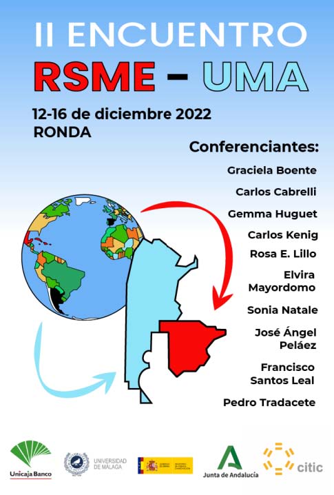 La cita contará con un panel de conferenciantes plenarios integrado, por parte de la UMA, por Graciela Boente (Universidad de Buenos Aires y CONICET), Carlos Cabrelli (Universidad de Buenos Aires e IMAS, UBA y CONICET), Carlos Kenig (Universidad de Chicago. Presidente de la IMU) y Sonia Natale (Universidad Nacional de Córdoba y CIEM-CONICET). Los conferenciantes propuestos por la RSME serán Gemma Huguet (Universitat Politècnica de Catalunya), Rosa E. Lillo (Universidad Carlos III de Madrid), Elvira Mayordomo (Universidad de Zaragoza), José Ángel Peláez (Universidad de Málaga), Francisco Santos Leal (Universidad de Cantabria) y Pedro Tradacete (Instituto de Ciencias Matemáticas ICMAT).