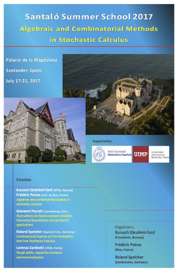 La Escuela de Investigación Lluís Santaló de la RSME celebrará su edición de 2017, del 17 al 21 de julio, en la sede de Santander de la Universidad Internacional Menéndez-Pelayo. Está dirigida por los profesores Kurusch Ebrahimi-Fard (NTNU, Noruega), Frédéric Patras (CNRS, Francia) y Roland Speicher (Saarland University, Alemania). El título de la escuela es “Algebraic and Combinatorial Methods in Stochastic Calculus” y está especialmente recomendada para estudiantes graduados y jóvenes investigadores (https://folk.ntnu.no/kurusche/santalo2017).Se impartirán los siguientes cursos: