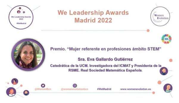 La presidenta de la RSME, Eva Gallardo Gutiérrez, ha sido galardonada en la categoría “Mujer referente en profesiones ámbito STEM” de los We Leadership Awards 2022 Madrid, cuyo objetivo pasa por dar visibilidad al talento femenino y a los liderazgos comprometidos con la igualdad. La entrega de estos premios tendrá lugar en el marco del congreso de Women Evolution “Liderazgos disruptivos y redes profesionales”, el próximo 1 de junio en el Caixaforum de Madrid, que se podrá seguir de forma presencial y online. Más información e inscripciones, en este enlace.