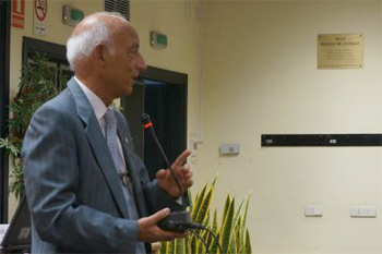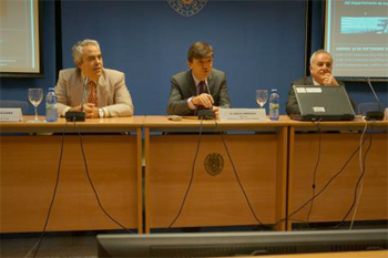 Mesa presidencial (de izquierda a derecha): Antonio Díaz-Cano (Decano), Carlos Andradas (Rector) y José Mendoza (organizador)