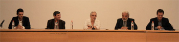 Mesa de la presentación de RSME-Imaginary. De izquierda a derecha: Joaquín Pérez, Antonio Campillo, Mª Dolores Suárez, Sebastià Xambó y José Miguel Angulo