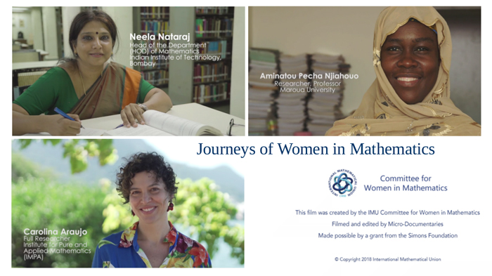 Este pequeño documental de unos veinte minutos expone las experiencias positivas y negativas que las mujeres matemáticas de todo el mundo afrontan día a día, contadas en primera persona por algunas de ellas. A lo largo del trabajo se presentan distintos perfiles de mujeres matemáticas de diferentes lugares que hablan sobre sus investigaciones, las aspiraciones matemáticas de las mujeres de su país y cómo la comunidad matemática internacional podría apoyarlas.