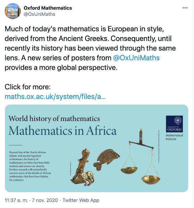 El Mathematical Institute de la University of Oxford ha presentado este mes una nueva iniciativa en pro de una perspectiva más global de la historia de la matemática. Se trata de una serie de posters, titulada World History of Mathematics, que serán exhibidos en el entresuelo del edificio Andrew Wiles y que se pueden descargar en este enlace. Los temas de los carteles son: