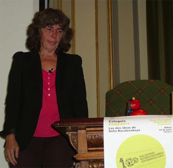 El pasado día 24 de junio de 2011 se celebró en la Biblioteca de Bidebarrieta de Bilbao el sexto Coloquio del Centenario de la Real Sociedad Matemática Española, cuyo título fue “Las dos ideas de Sofia Kovalevskaya”, y que corrió a cargo de Michèle Audin (Universidad de Estrasburgo, Francia). El acto fue presidido por María Jesús Carro (Presidenta del Comité C3 para la Celebración del Centenario de la RSME), que estuvo acompañada por Jasone Astola (Directora para la Igualdad de la UPV/EHU) e Iñaki López de Agileta (Directo del Área de Cultura del Ayuntamiento de Bilbao).Antes de comenzar la conferencia, Pedro Alegría (miembro del Comité Organizador) y Michèle Audin hicieron entrega de los premios del “Concurso de trabajos sobre Sofia Kovalevskaya” organizado con motivo del Coloquio (los trabajos pueden verse en http://www.ehu.es/~mtwmastm/audin.html).