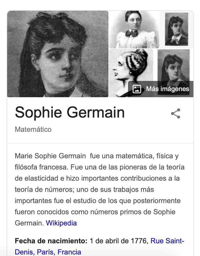 Más aún, en una época en que existen grandes proyectos de visibilización de la mujer en la ciencia, sigue ocurriendo que al teclear en google “Sophie Germain + Wikipedia” en el resumen que aparece a la derecha de la web se lea “Matemático” en la descripción de su profesión.
