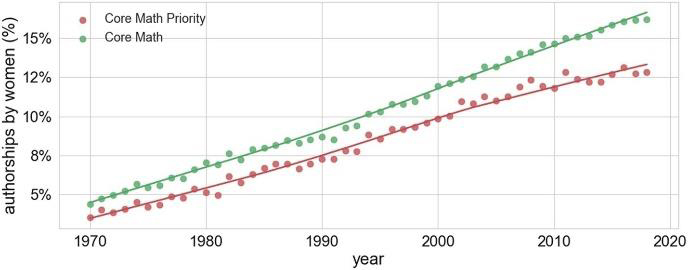Este artículo analiza las autorías de artículos de mujeres matemáticas, físicas y astrónomas en diferentes revistas académicas en un periodo que abarca del 1970 al 2019. Centrándonos en el campo de las matemáticas, el estudio considera, primero, un grupo de 1716 revistas matemáticas importantes con un total de 2.9 millones de autorías en ese periodo de tiempo (el cual denominan Core Math); segundo, un grupo más restrictivo de 175 revistas de alto ranking con un total de 900 000 autorías (denominado Core Math Priority); y finalmente un grupo conteniendo las 18 revistas matemáticas de más prestigio entre las que se encuentran revistas como Annals of Mathematics o Inventiones Matematicae. El resultado del análisis muestra que, aunque el porcentaje de autorías femeninas ha incrementado en general en el tiempo, el porcentaje en cualquiera de los grupos se sitúa por debajo del 20 %, estando alrededor del 12 % en el grupo Core Math Priority y no llegando siquiera al 5 % en el Journal of the American Society, que tiene el menor porcentaje de las 18 revistas consideradas en el último grupo. Claramente se muestra una tendencia en la que, mientras mayor sea el ranking de la revista, menor es el porcentaje de autorías femeninas. Estos porcentajes, además, son mucho menores al porcentaje de mujeres en el campo de las matemáticas, que se estima actualmente por encima del 20 %, lo cual enfatiza una clara infrarrepresentación de la mujer en las publicaciones matemáticas.