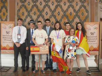 El pasado 15 de julio tuvo lugar la ceremonia de clausura de la 56 Olimpiada Internacional de Matemáticas en la ciudad tailandesa de Chiang Mai, sede de esta edición de la IMO, que es como se conoce mundialmente esta prestigiosa competición siguiendo su acrónimo en inglés. La delegación de España estuvo formada por Luis Crespo Ruiz (Cantabria), Gonzalo Cao Labora (Galicia), Ismael Sierra del Rio (Madrid), Jesús Dueñas Pamplona (Castilla y León), Cesc Folch Aldehuelo (Cataluña) y Berta García González (Madrid), ganadores de la 51 Olimpiada Matemática Española celebrada en Badajoz.María Gaspar Alonso-Vega (UCM) como jefa de delegación y Marco Castrillón López (UCM) como profesor tutor completaron el quipo. Tras la realización de las difíciles pruebas los días 10 y 11, se conoció finalmente en la última reunión del jurado del día 14 la distribución de premios, en los que nuestro equipo ha ganado una medalla de bronce (Ismael) y dos menciones de honor (Gonzalo y Cesc). Nuestros chicos pudieron disfrutar el resto de los días de la cultura y tradiciones del país anfitrión, además de compartir vivencias con las otras 104 delegaciones participantes. En dicha clausura, el equipo de Tailandia pasó por último la bandera olímpica al equipo Hong-Kong, delegación que invitó a todos los equipos a participar en la 57 edición de la IMO, de la que será sede en 2016.