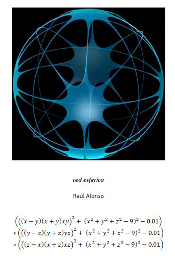 El premio a la mejor imagen del concurso RSME-Surfer, patrocinado por Universia, fue otorgado a Raúl Alonso, ahora alumno de 4º de ESO en el Colegio Valle del Miro de Valdemoro, por su obra “Red esférica”. Del fallo del jurado se dio cumplida cuenta el pasado 30 de junio en la web de RSME-Imaginary y también en este mismo Boletín (nº 320, de 2/7/2012). Además, Red esférica fue imagen de portada de La Gaceta de la RSME (vol. 15, nº 2), con la consiguiente nota biográfica sobre el galardonado.