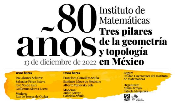 En el marco del 80 aniversario del Instituto de Matemáticas de la Universidad Nacional Autónoma de México el próximo 13 de diciembre se celebrará una mesa redonda en formato híbrido en homenaje a los matemáticos Francisco González Acuña, Santiago López de Medrano y Alberto Verjovsky Sola. El acto tendrá lugar en la Unidad de Cuernavaca, está organizado por Aubin Arroyo y Fabiola Manjarréz y contará con la participación de Paz Álvarez Scherer, Salvador Pérez Esteva, José Seade Kuri y Guillermo Sierna Loera, Luz de Teresa Oteyza y Gabriela Araujo.
