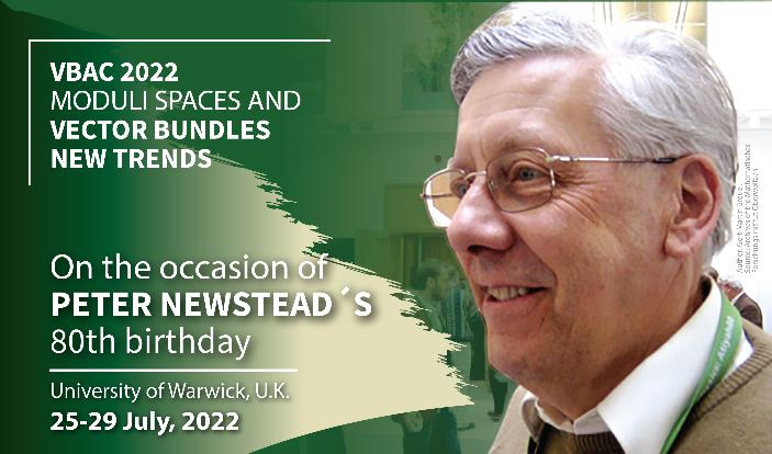 En particular, el VBAC 2022 Moduli Spaces and Vector Bundles – New Trends será en honor de los 80 años de Peter Newstead. Dada la relación de Peter Newstead con España tendremos los siguientes conferencistas españoles en el VBAC 2022: Emilio Franco (University of Lisbon, Portugal), Oscar García- Prada (ICMAT), Marina Logares (Universidad Complutense de Madrid), Vicente Muñoz (Universidad de Málaga), Alfonso Zamora (Universidad Politécnica de Madrid) y Montserrat Teixidor i Bigas (Tufts University, EE.UU.). La Conferencia VBAC 2022 se llevará a cabo en la Universidad de Warwick, del 25 al 29 de julio de 2022, en un formato híbrido y, con suerte, con un componente importante en persona.